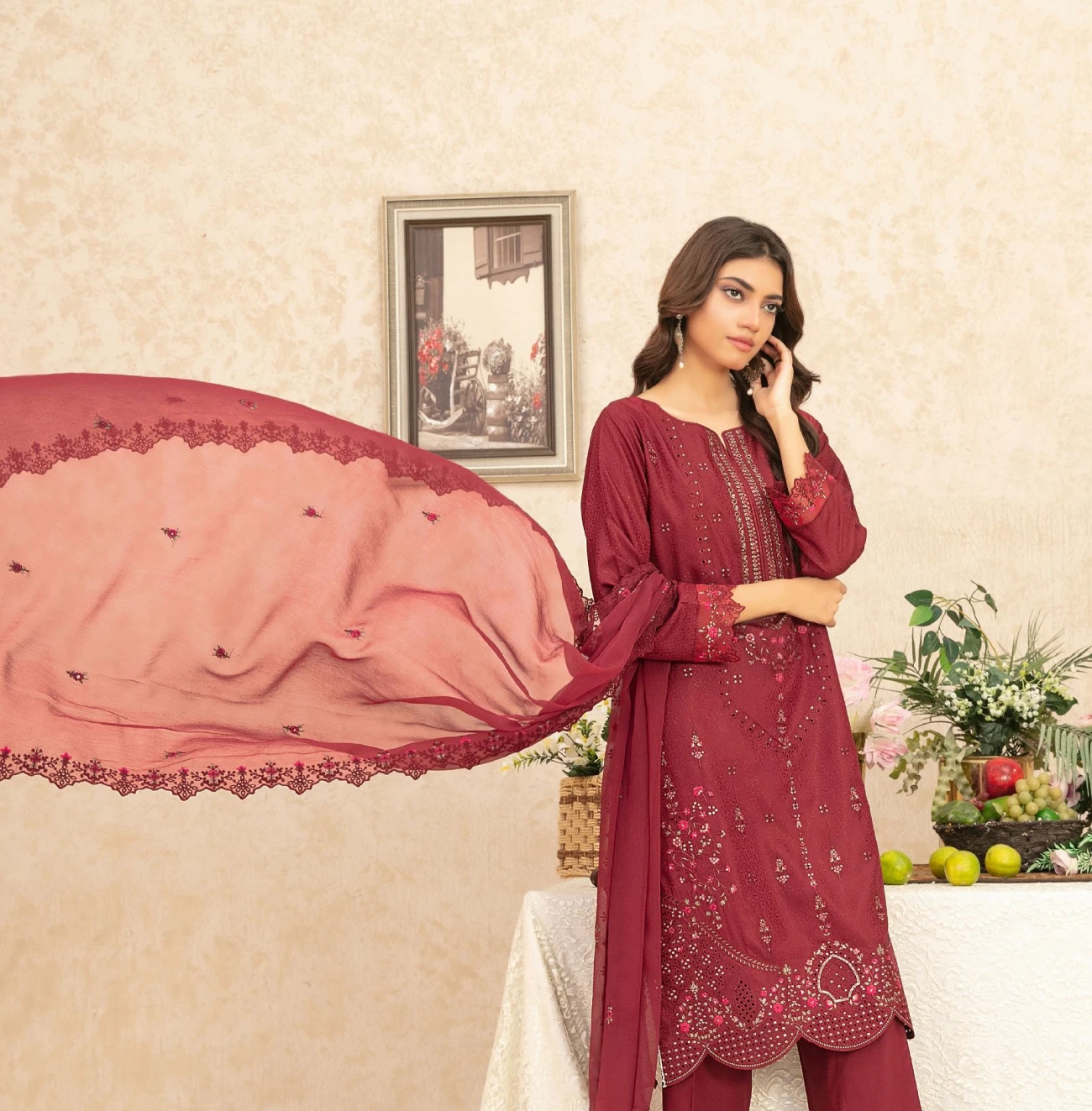 Step into elegance with the Joom unstitched 3-piece Suit. Featuring exquisite embroidery on premium fabrics, this Pakistani women’s collection includes a beautifully designed shalwar, shirt, and dupatta. Perfect for creating a sophisticated and personalized look.